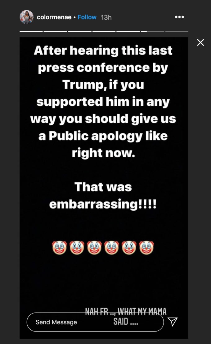 "After hearing this last press conference by Trump, if you supported him in any way you should give us a public apology like right now," Carter said. "That was embarrassing!"