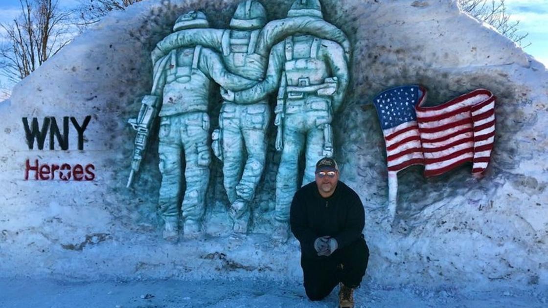 His first sculptures were during the Buffalo Bills NFL playoff season as the Bills gained momentum. Most recently, he created at 10-foot tribute in Arcade to men and women serving in the military by carving into a 10-foot wall of snow, which he titled “Tribute to WNY Heroes.”