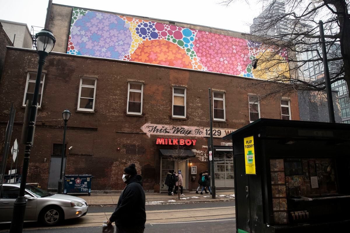 The wall was a complicated one to beautify: The roof of Milkboy, which sits adjacent to it, was unable to hold scaffolding and the number of people normally required to paint this type of mural installation, said Nadia Malik of Mural Arts. For help, Mural Arts called in Roe Fabricators, a company that specializes in design, fabrication and installation of grand-format graphics and outdoor-advertising structures. Roe suggested installing a frame on the wall and attaching to it a digitally-printed vinyl banner of the mural.