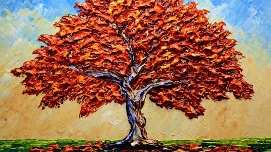 “The first thing she told me when we first met was that she puts a little bit more sparkle in this,” he said, dimming the lights after moving a comparatively simple piece — “Maple of the Autumn Sunrise,” a 30-inch-by-40-inch painting that proved it was hiding secret sapphire hues in its trunk and literally glistening accents in its flame-informed hues for the leaves.