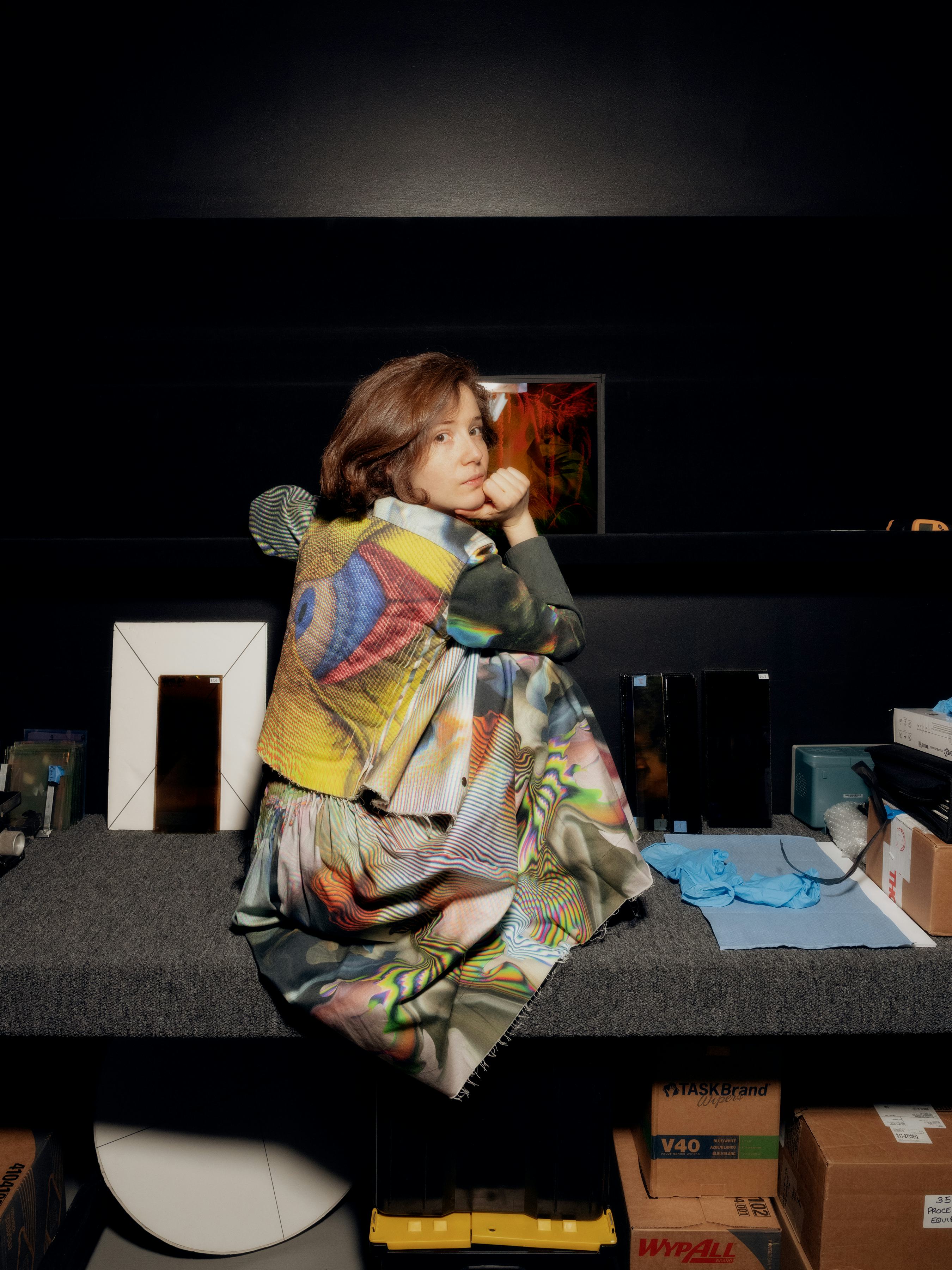 It took more than a year of experimentation, and $75,000 of her own money, to create the brilliantly technicolor grating now in Meyohas’s hands. Each groove, about 100 times thinner than a human hair, unites to create an image of a three-breasted woman. Meyohas likes the juxtaposition between the timelessness of the female form and the sophistication of the medium. Like her earlier work, it “inserts a body in a system it’s not meant to be in,” she says.