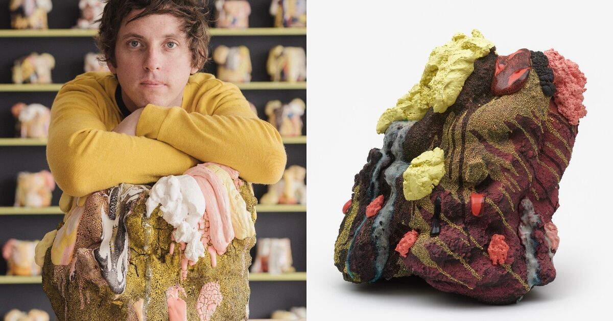 To make his vibrant, knobbly sculptures, Rochefort layers unfired clay and glass. Between airbrushing layers of color and applying colorful glazes, he fires the pieces multiple times, building up their surfaces through a process that introduces cracks and peeling to enhance their texture.